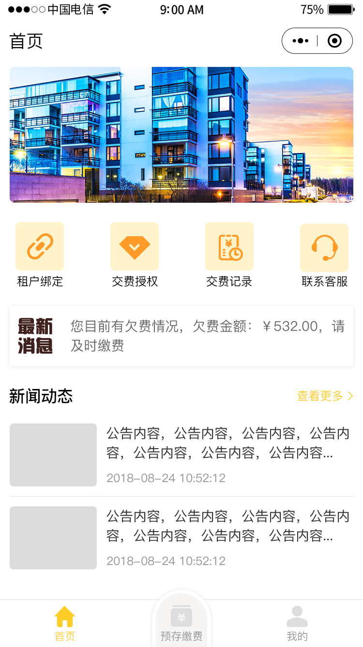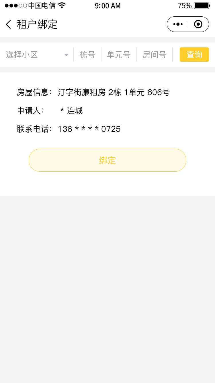 小程序端的主要用户群体为租户,租户可以通过绑定住房,在小程序中实现在线交房租的操作,相较于传统交租方式,不需要花费到现场以及排队的时间,节约了时间,提高了效率。
